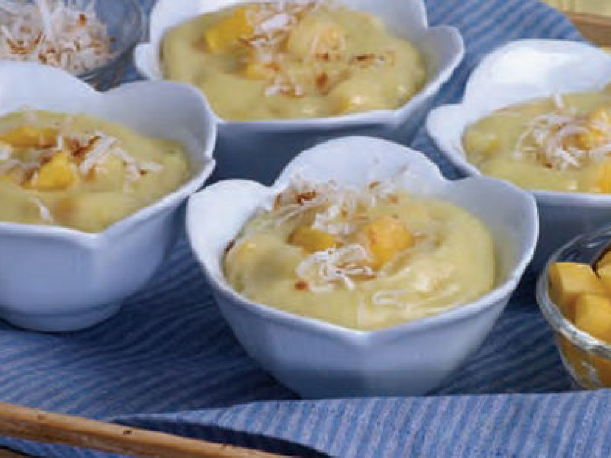 Pouding au lait de coco et à la mangue sans gluten Dessertfacile20 min Envoyer cette recette à un ami Imprimer cette page Poser une question à l'auteur Publier votre photo de cette recette Ingrédients 4 1 mangue bien mûr 1/2 tasse de sucre 2 cuillères à table + 1 cuillères à thé de fécule de maïs 1 pincée de sel 3 oeufs 1 boîte de 13.5 oz de lait de coco Noix de coco grillées