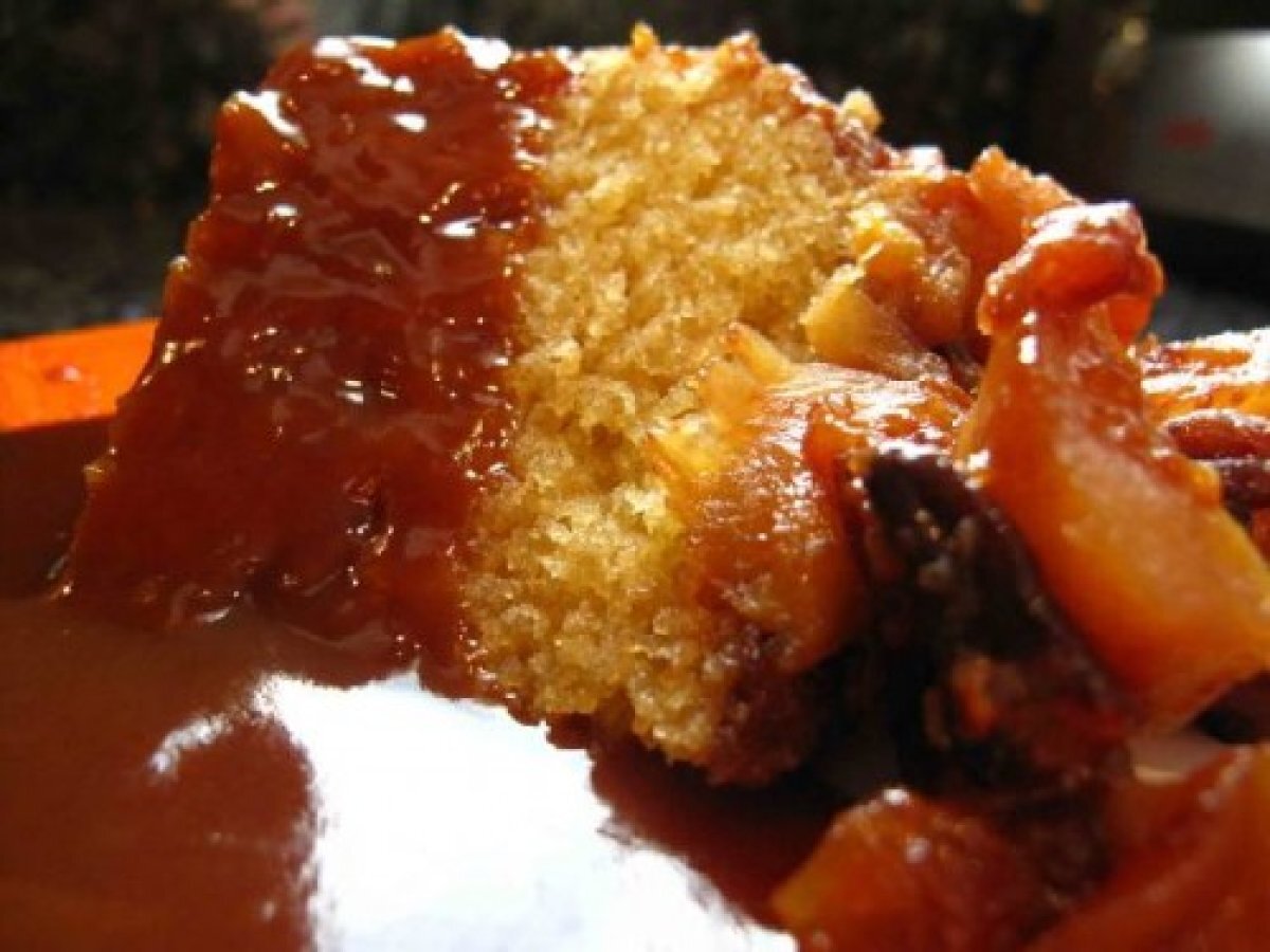 Pudding vapeur pomme-noix, sauce au caramel.