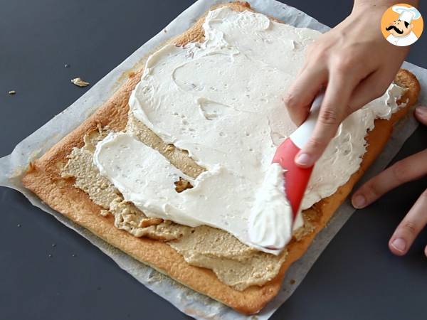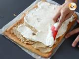 Etaler la crème Kinder Bueno sur toute la surface de la génoise. Recouvrir avec la crème vanille. Attention: gardez-en pour le dessus du roulé.