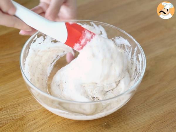 Ajoutez les blancs montés fermement aux poudres, et mélangez délicatement en soulevant les blancs afin de ne pas les écraser.