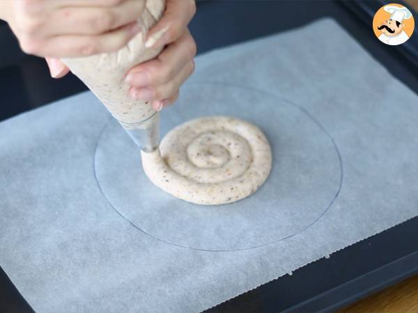 A l'aide d'une poche à douille, dessinez un cercle de ce mélange sur une feuille de papier sulfurisé. Le cercle doit faire 18 cm de diamètre, dessinez le sur le papier sulfurisé avant de pocher le biscuit. Faites cuire 12 minutes à 190°C.