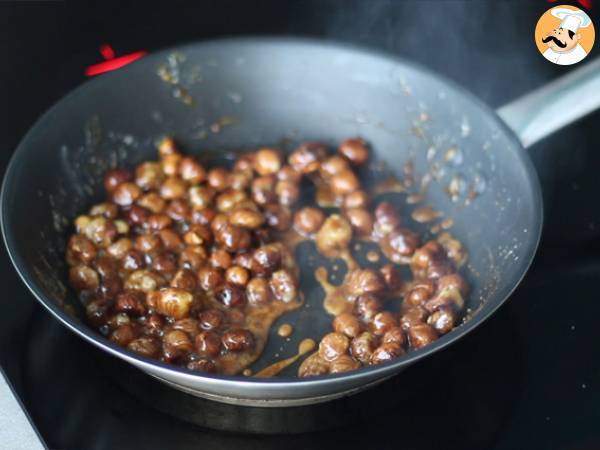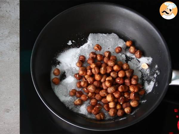 Mettez l'eau et le sucre dans une poêle sur feu moyen. Lorsque le mélange forme des bulles, ajoutez les noisettes.