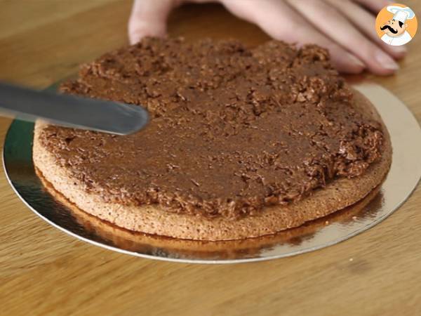 Appliquez immédiatement ce mélange sur la dacquoise noisettes, et lissez bien afin d'avoir une couche bien uniforme. Réservez au frais.