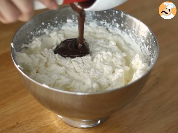 Montez la crème liquide bien froide au fouet électrique. Faites fondre le chocolat et versez le sur la crème bien montée.