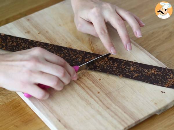 Coupez une bande de rhodoïd d'environ 25 cm. Faites fondre 50 gr de chocolat noir, et versez le sur toute la longueur de la bande. A l'aide d'une spatule, étalez le bien afin qu'il recouvre toute la bande. Ecrasez 2 à 3 crêpes dentelle en paillette, et saupoudrez cette bande. Décollez-la du plan de travail à l'aide de la pointe d'un couteau, et mettez la au frais pendant environ 15 minutes.