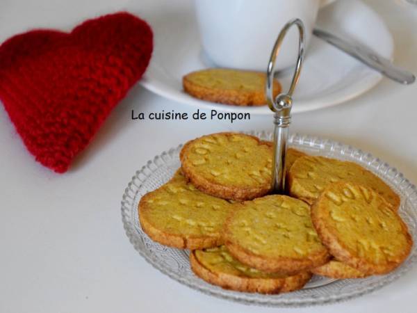 On ne se lasse pas des sablés qui croquent gentiment sous la dent! Avec un léger goût de pistache et une pointe de yuzu, ces sablés deviennent un délicieux moment de gourmandise... Un petit goût de Saint Valentin...