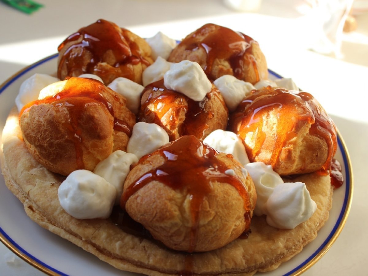 Le gâteau est bon. C'est un "Saint Honoré" revisité. Mais le VRAI Saint Honoré comporte des fruits confits et du kirsch dans la crème pâtissière.. C'est le jour et la nuit.