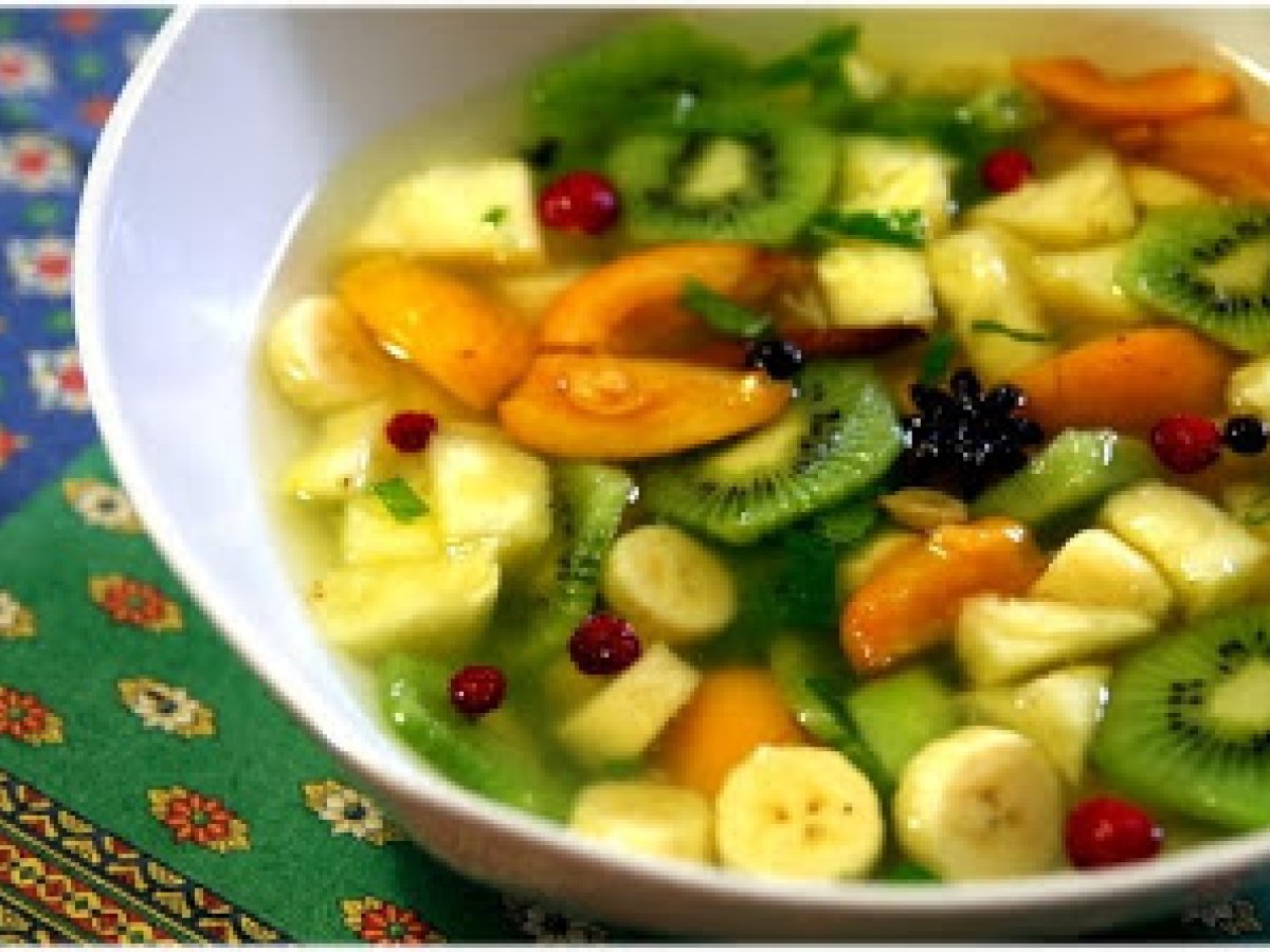 Salade de fruits des iles portugaises Dessertfacile12 min Envoyer cette recette à un ami Imprimer cette page Poser une question à l'auteur Publier votre photo de cette recette Ingrédients 6 1/2 petit ananas des Açores 8 nèfles du Japon 4 petites bananes (des Açores ou de Madère) 2-3 kiwis 1 poignée de fraises des bois jus d'1 citron vert 4-5 feuilles de menthe fraîche, ciselées Sirop : 1/2 l d'eau 4 cuillères à soupe de sucre 1 bâton de cannelle 3-4 grains de poivre de la Jamaïque entiers 1 étoile de badiane 1 filet de vin blanc