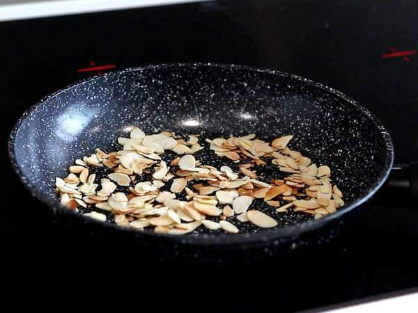 Faire griller des amandes effilées dans une poêle à sec pendant quelques minutes.