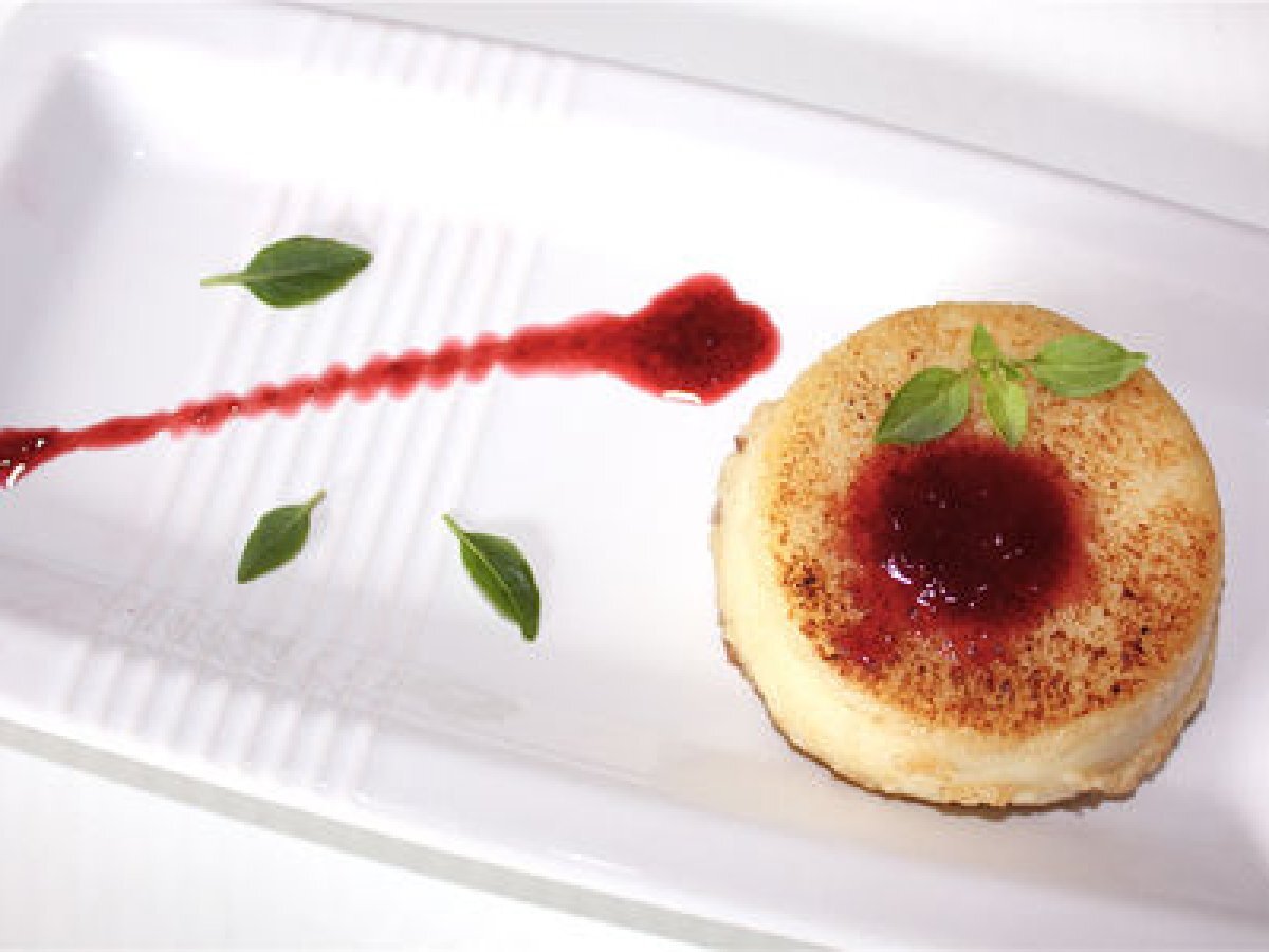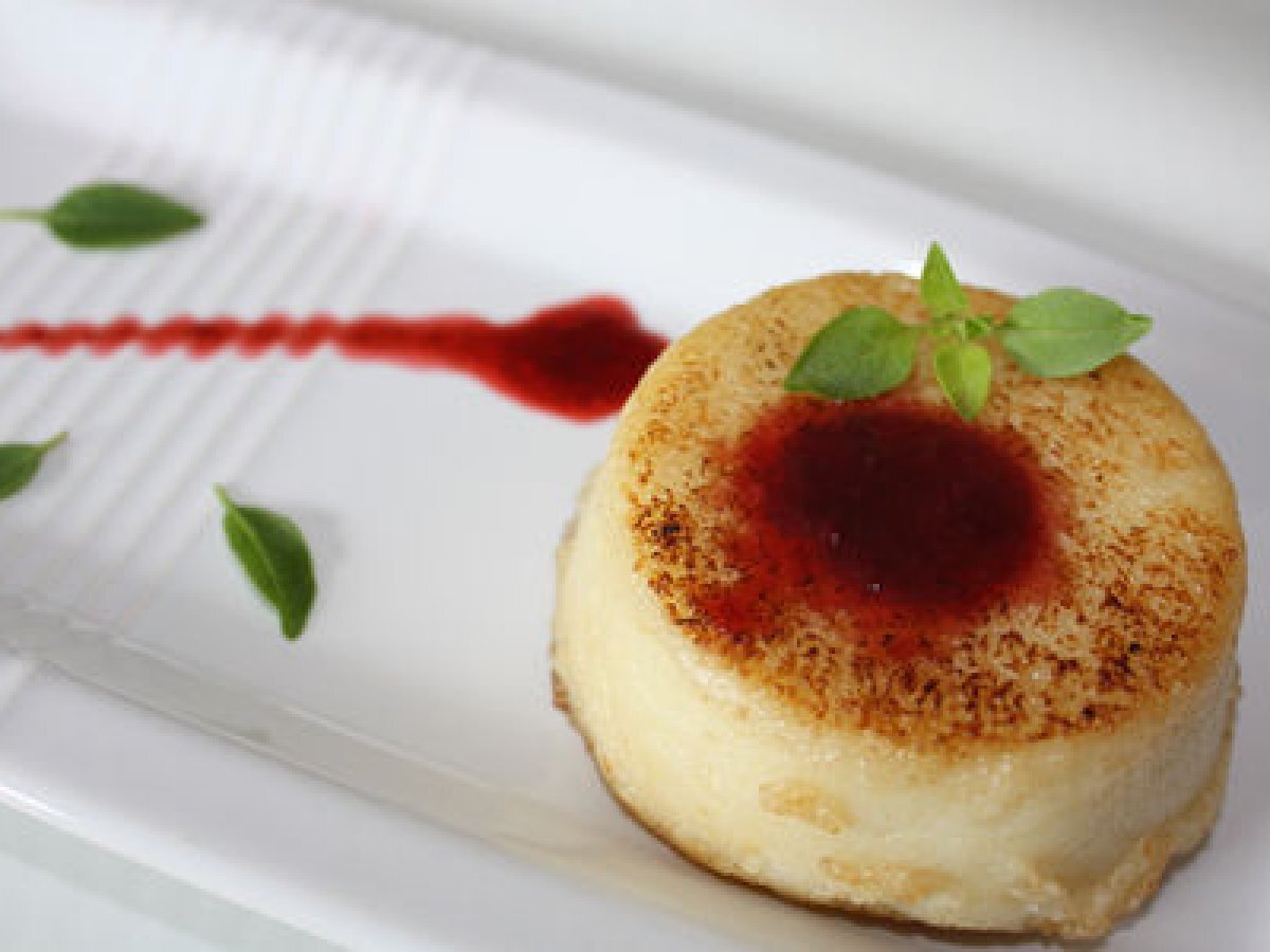 Semoule citron/coco fondante tiède et coulis de framboises au balsamique