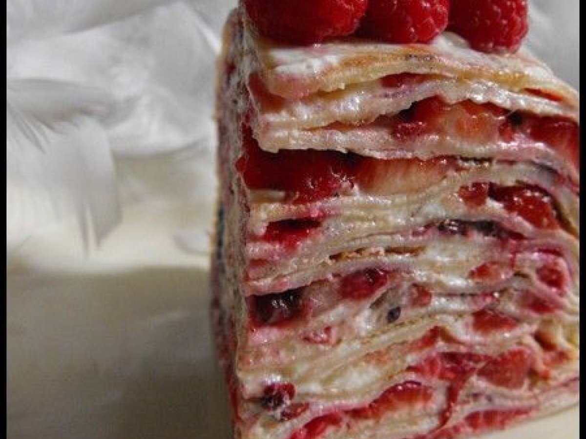 Sensation d'été (gâteau de crêpes au mascarpone & fruits rouges) Dessertfacile50 min401 Kcal Envoyer cette recette à un ami Imprimer cette page Poser une question à l'auteur Publier votre photo de cette recette Ingrédients 6 Environ 12 crêpes de même diamètre 250 g de mascarpone 3 cuillères à soupe de sucre 4 cuillères à soupe de lait 500 g de fruits rouges (ici fraises "Mara des bois", framboises, mûres) 1 cuillère à soupe de confiture de framboises (facultatif) Coût estimé: 7.07Euros€ (1.18€/part)