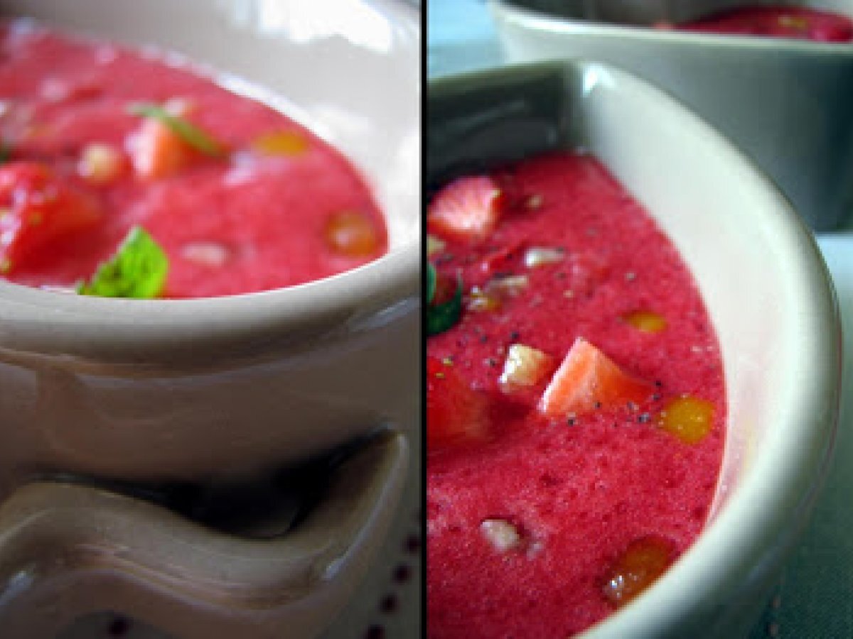Soupe de framboises au citron vert et à la menthe, fraises coupées
