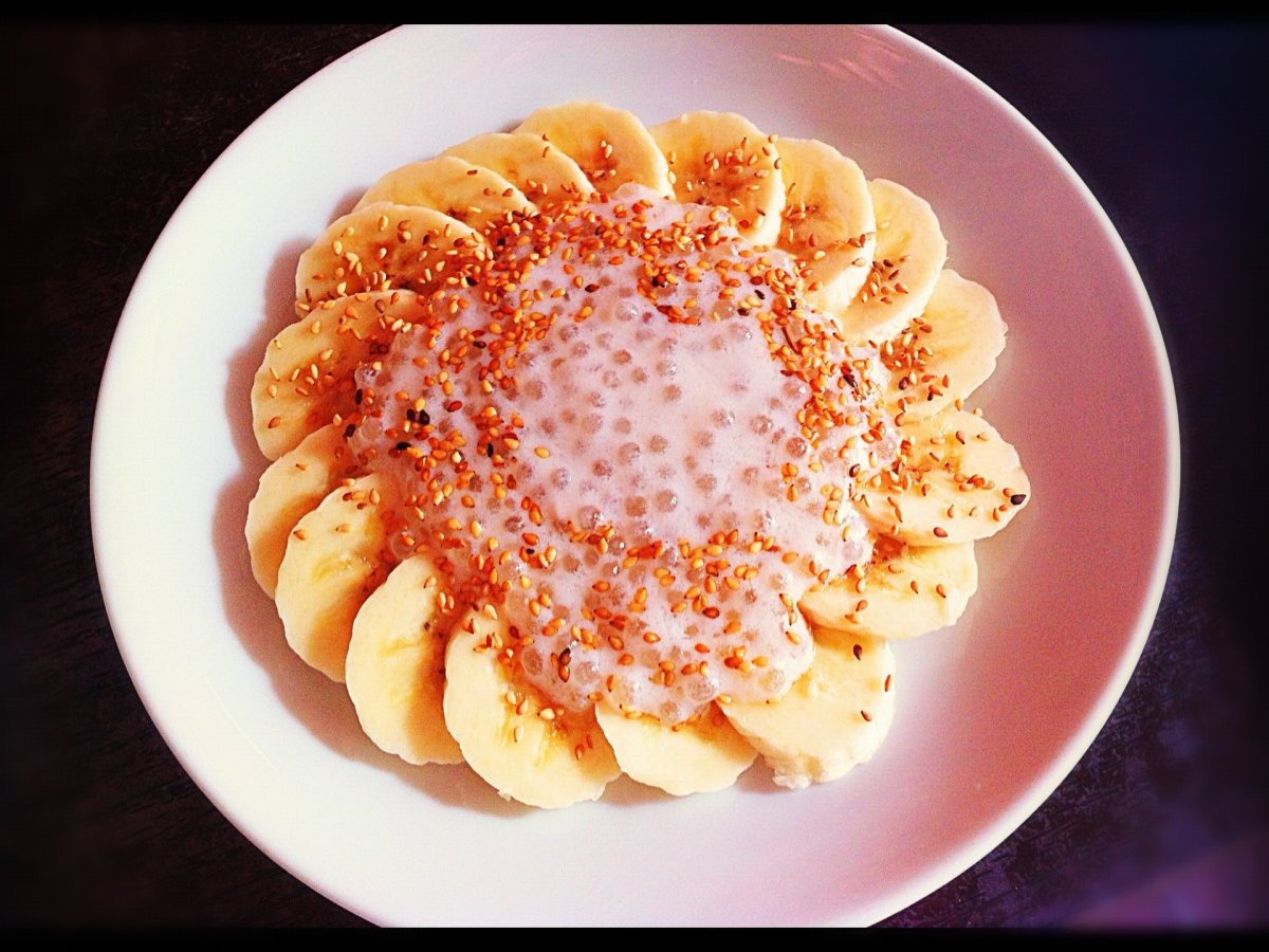 N'étant pas un as des desserts, voici donc un des rares desserts à ma portée. C'est une soupe de tapioca coco sur un lit de banane parsemée de sésames grillés. Pour ceux qui ne connaissent pas le tapioca, ce sont de petites fécules fabriquées à partir des racines de manioc amer. De goût assez neutre, le tapioca est également appelé "perle du japon".