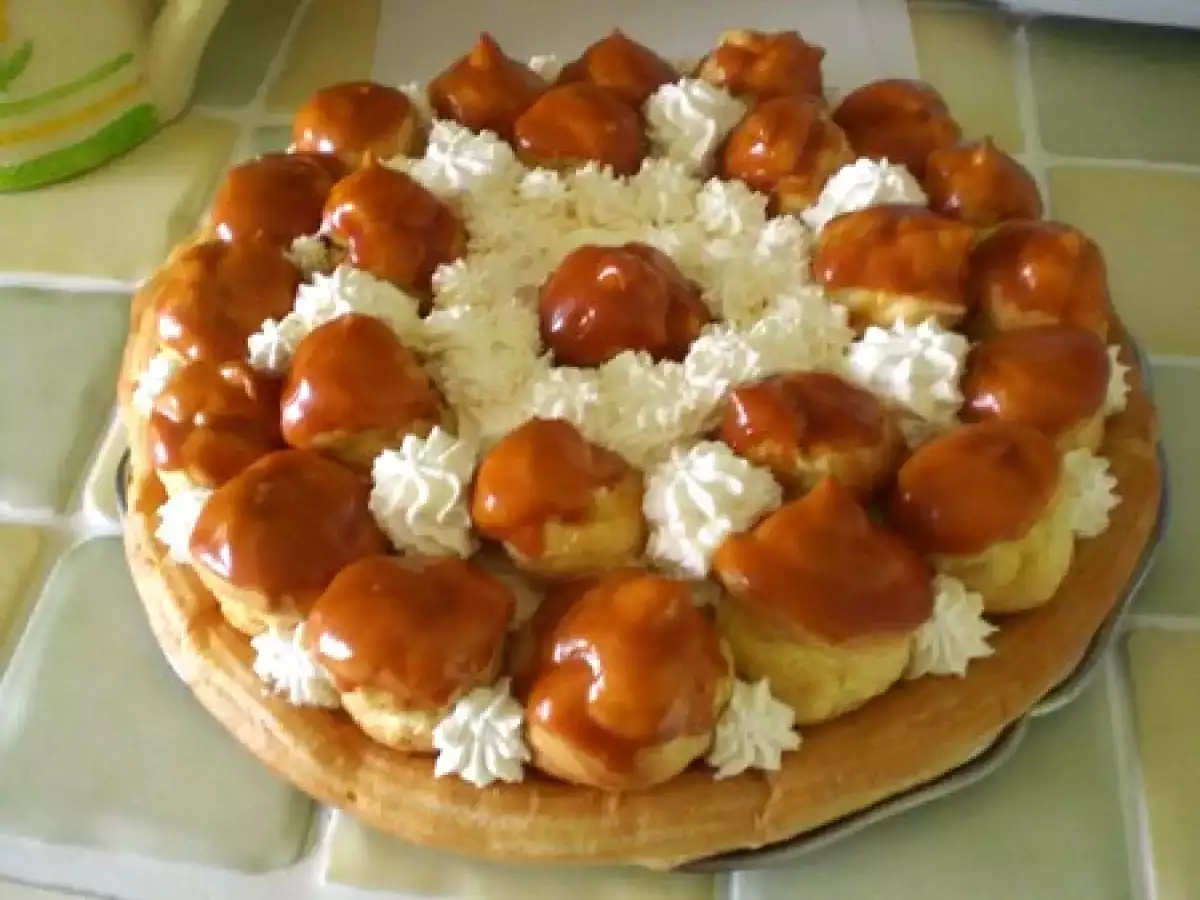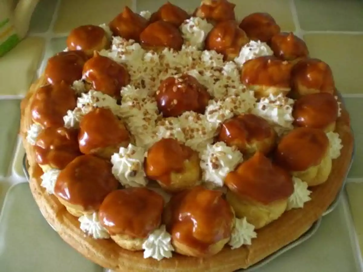 Tremper la moitié des choux dans le caramel tiédi et déposer-les sur la crème pâtissière.