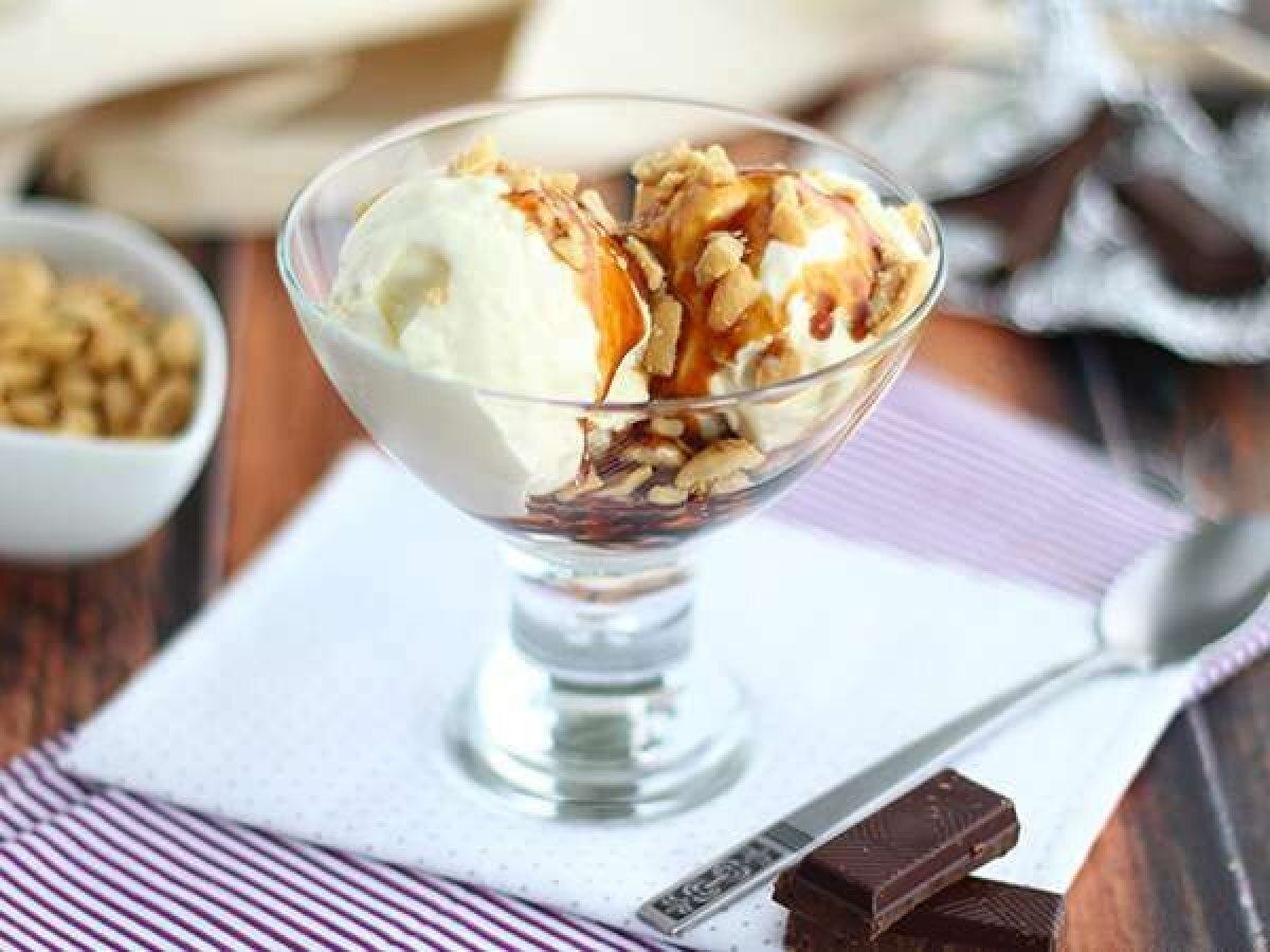 Sortez la glace 5 minutes avant de servir. Servez des boules dans une coupe à glace, et versez du caramel dessus.
