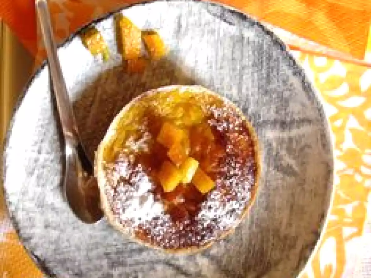 Tarte au potiron à l'orange. PrécédentSuivant Dessertfacile25 min346 Kcal Envoyer cette recette à un ami Imprimer cette page Poser une question à l'auteur Publier votre photo de cette recette Ingrédients 4 pâte brisée 150 g de potimarron cuit à la vapeur 30 g de sucre en poudre 1/2 orange non traitée 1 oeuf 10 g de raisins secs 1 pincée de cannelle quelques zestes confit sucre glace pour le décoration Coût estimé: 2.53Euros€ (0.63€/part)