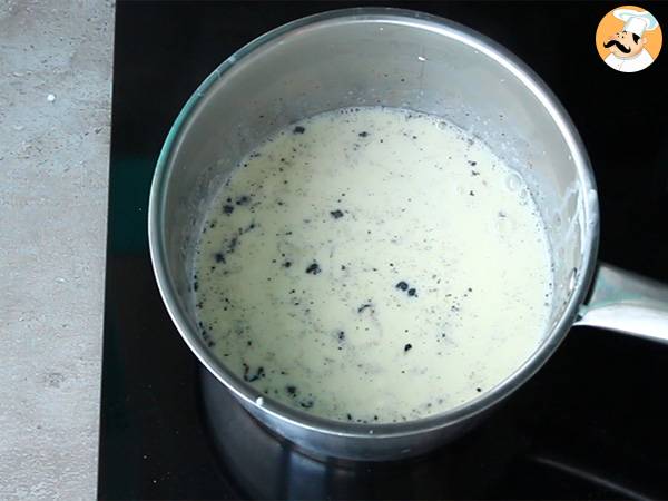 Battre les jaunes d’œuf avec le sucre jusqu'à ce que le mélange blanchisse. Mettre la crème, le lait et le lait concentré sucré dans une casserole à bouillir. Y ajouter les graines de la gousse de vanille. Lorsque le mélange bout, l'ajouter aux jaunes d’œuf sucrés.