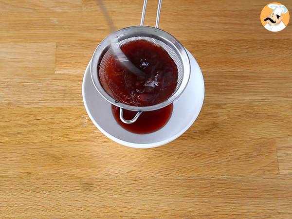 Faites chauffer la confiture 30 secondes au micro-ondes, puis la filtrer afin d’ôter les morceaux. (Si vous utilisez de la gelée de groseille, pas besoin de la filtrer).