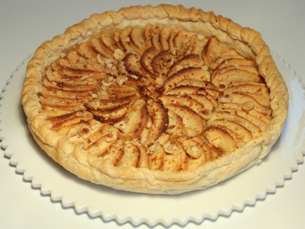 Pour changer de la classique tarte aux pommes, elle est parfumée aux zestes d'orange et aux noisettes