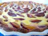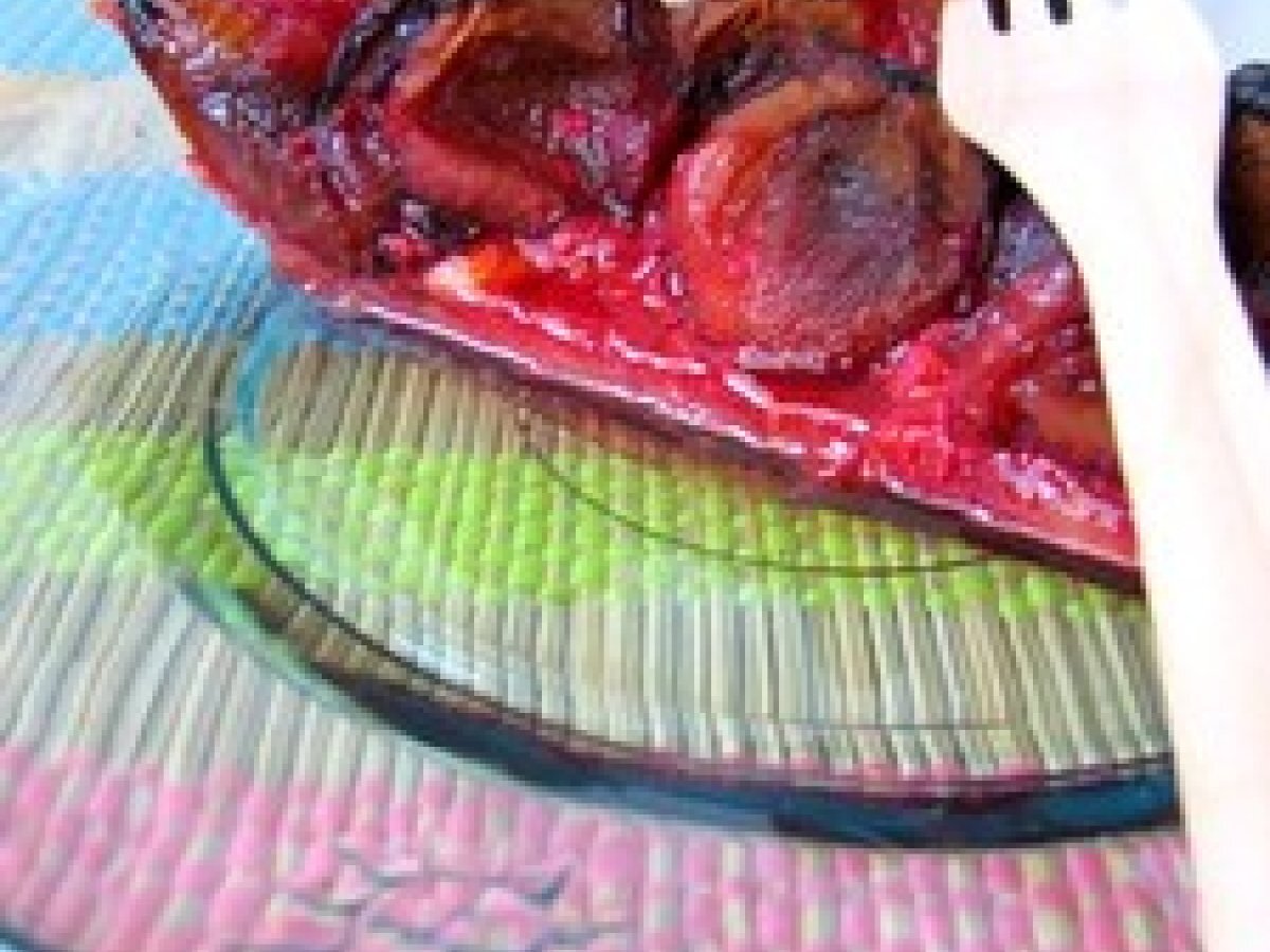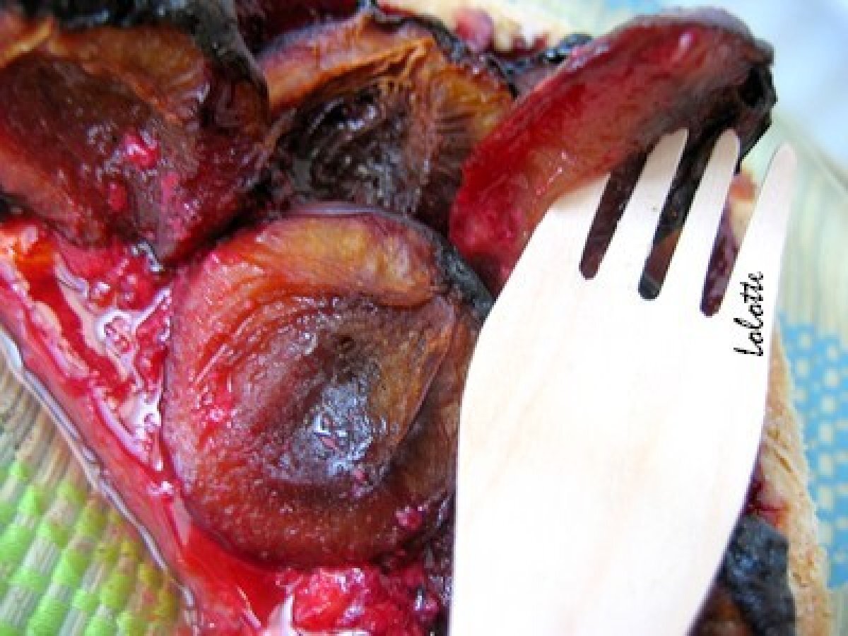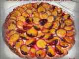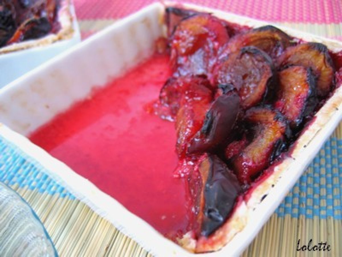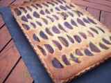Tarte aux quetsches et pralines roses, aux flocons de quinoa