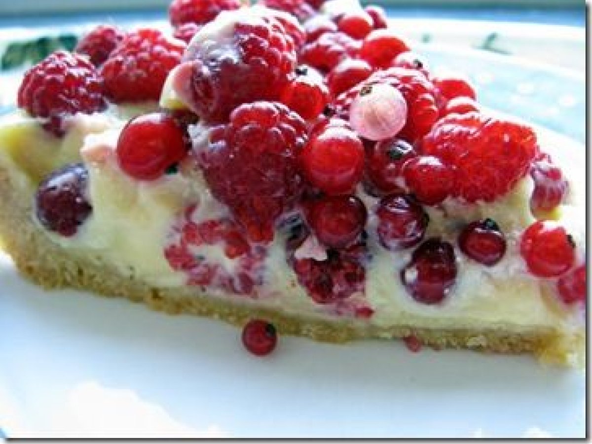 Tarte sablée, crème pâtissière à la vanille et fruits rouges du jardin.