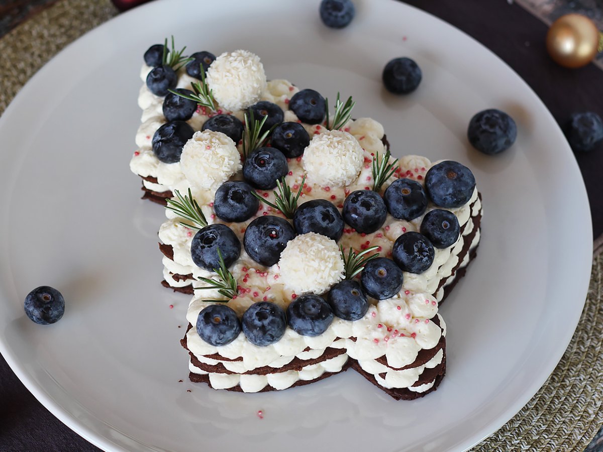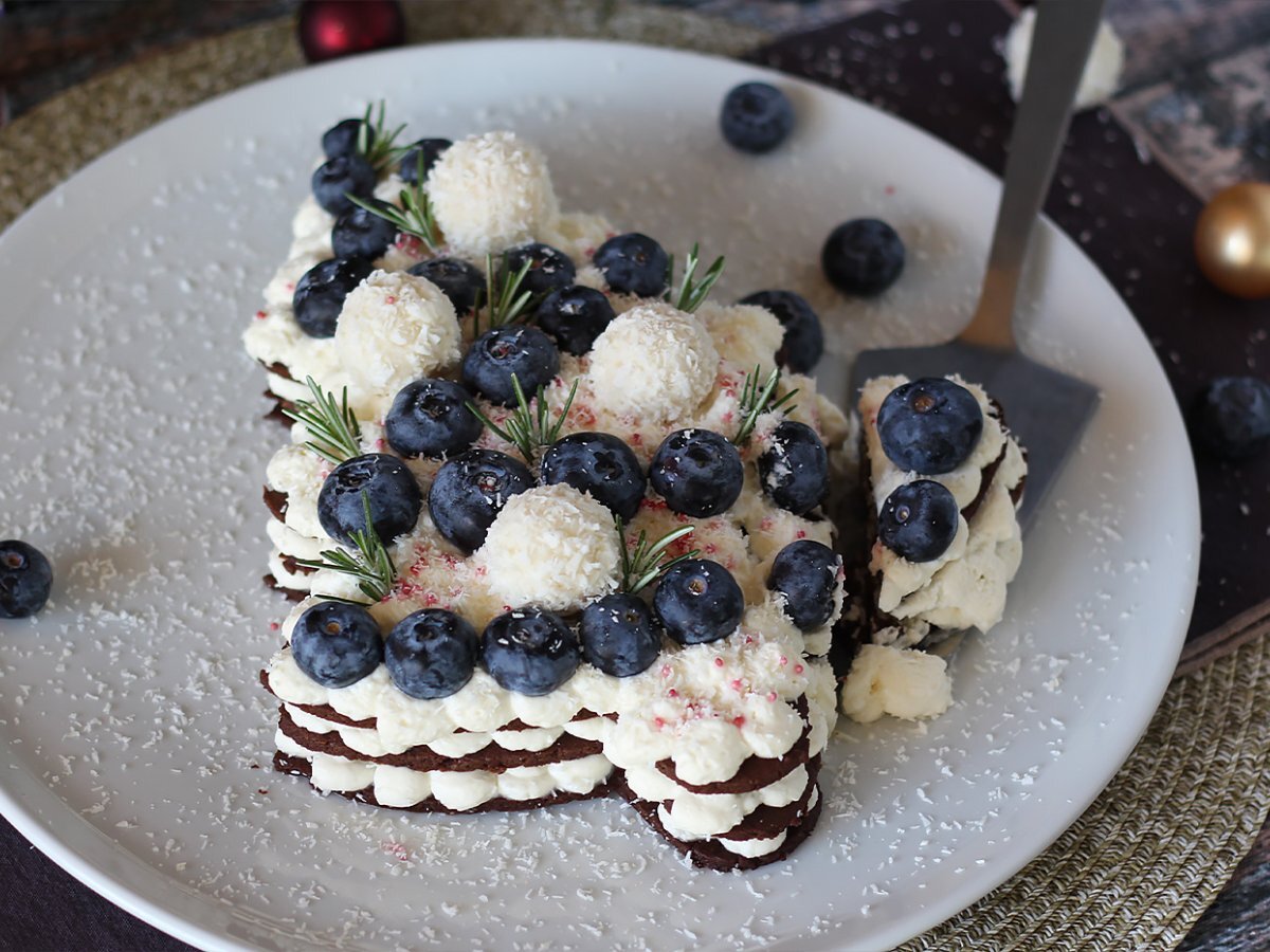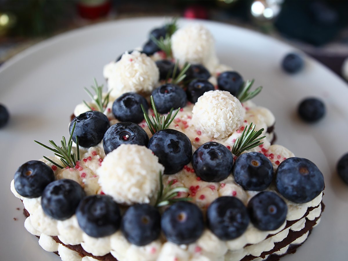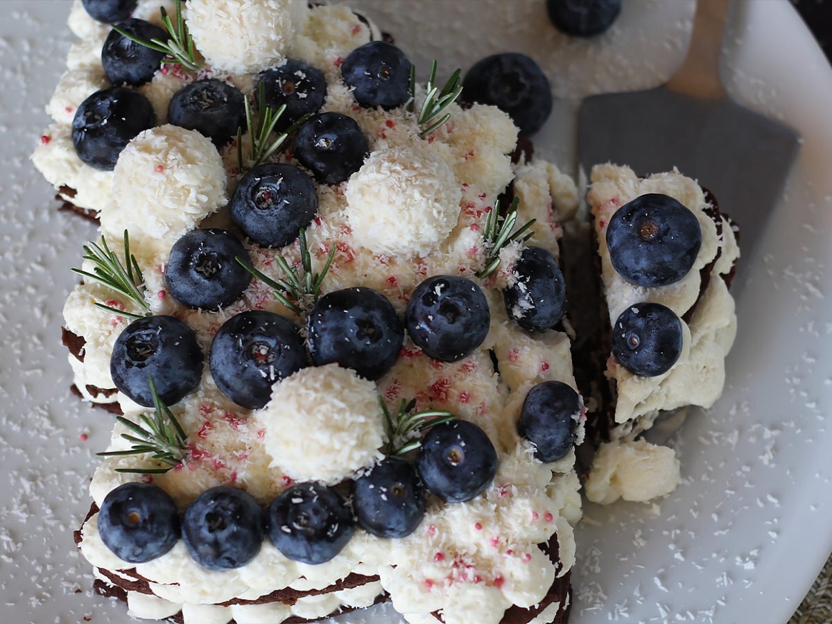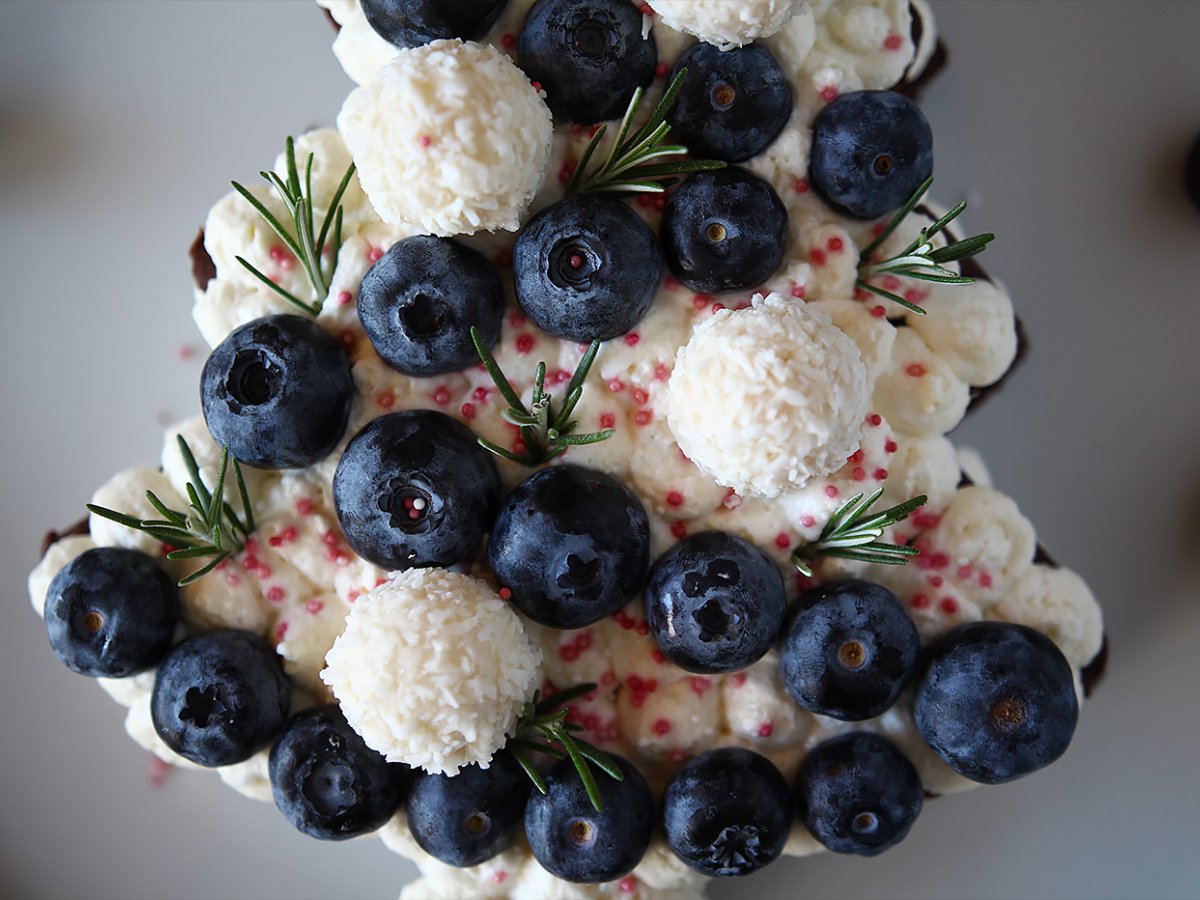 Décorer le sapin : nous avons réalisé une guirlande de myrtilles puis ajouté des boules en Raffaelo et des petites paillettes en perles colorées. Nous avons également ajouté du romarin frais pour faire les branches du sapin, et de la noix de coco râpée pour la neige.