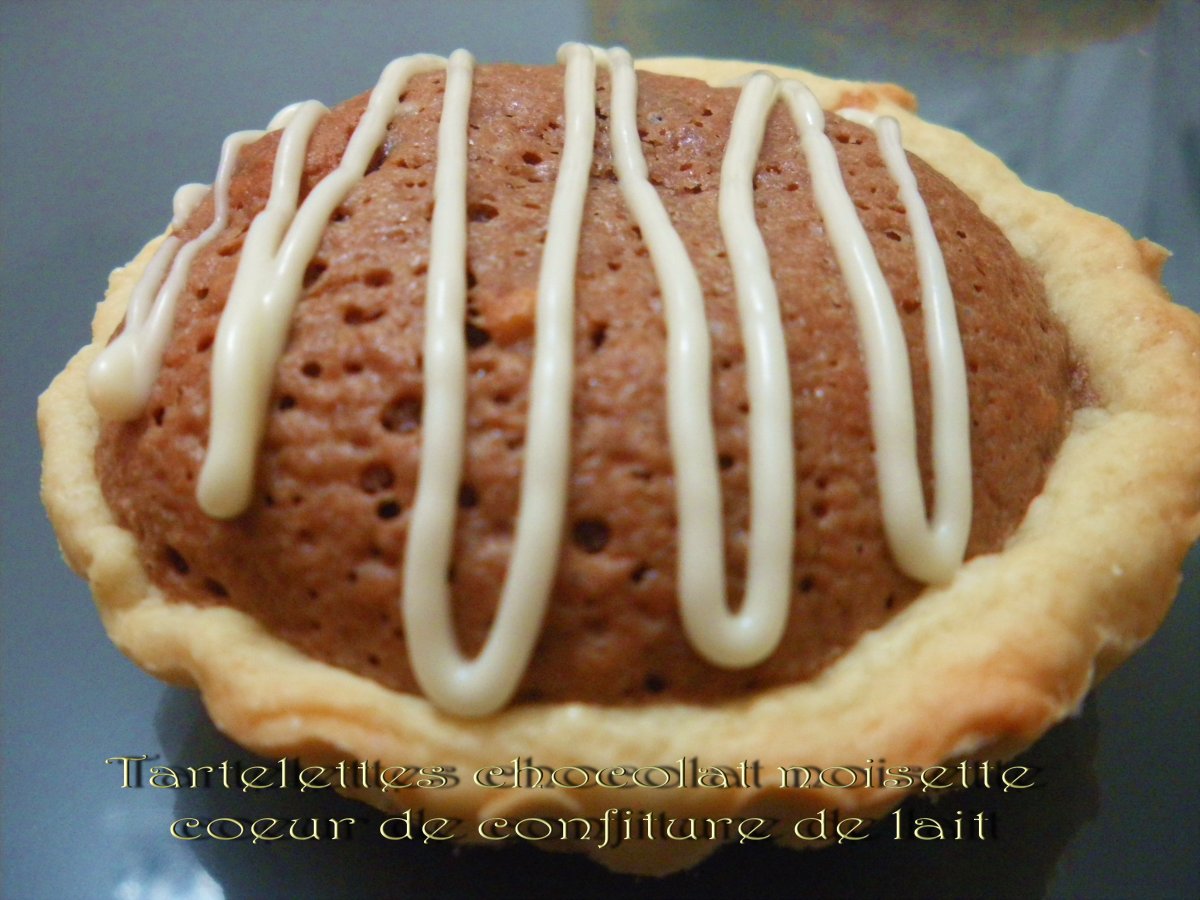 Tartelette chocolat noisette au coeur de confiture de lait PrécédentSuivant Dessertmoyen55 min641 Kcal Envoyer cette recette à un ami Imprimer cette page Poser une question à l'auteur Publier votre photo de cette recette Ingrédients 8 La pâte brisée sucrée : 170g de farine 50g de sucre 70g de beurre 40ml d'eau froide Pour la garniture : 200g de chocolat aux noisette Côte d'Or 60g de beurre 2 cuillères à soupe de crème fraîche liquide 50g de sucre 2 oeufs 40g de poudre de noisette 25g de farine De la confiture de lait pour leur c?ur Du chocolat blanc pour la finition Coût estimé: 9.05Euros€ (1.13€/part)