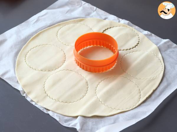 Nous avons opté pour une pâte feuilletée ronde et avons découpé des cercles à l'intérieur. Vous pouvez également utiliser une pâte feuilletée rectangulaire et découper 6 rectangles dans la pâte.