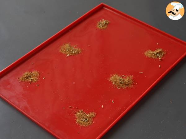 Déposer un peu de sucre sur une plaque en silicone ou une plaque recouverte de papier sulfurisé. Ajouter également une pincée de romarin par dessus.