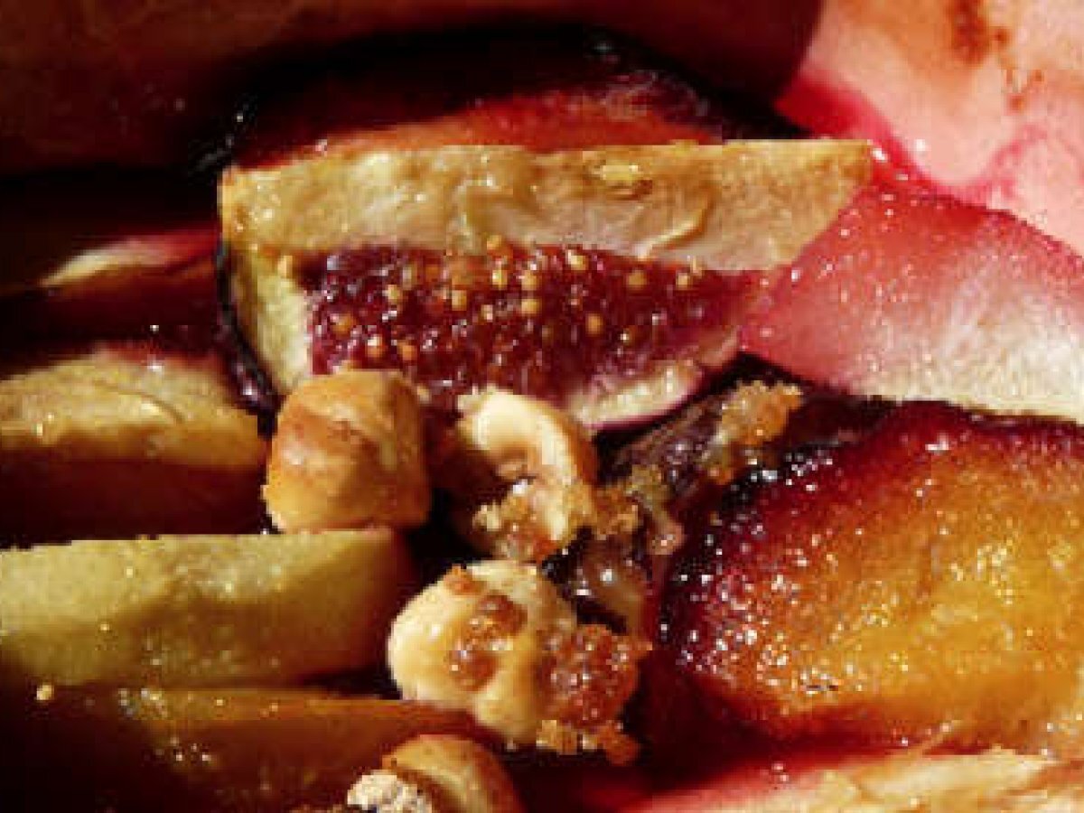 - Préchauffez votre four à 200 °C . Lavez et découpez les fruits en quartiers de taille moyenne . Disposez les dans un plat en les intercalant , vous pouvez les serrer car ils rétréciront à la cuisson . Disposez 4/5 noisettes par plat . Saupoudrez d'une cuil à soupe de cassonade . Faites cuire 20 minutes , versez sur chaque plat 1 cuil à café de sirop d'érable et faites cuire à 175 °C entre 10 à 15 minutes . Mangez les tièdes .