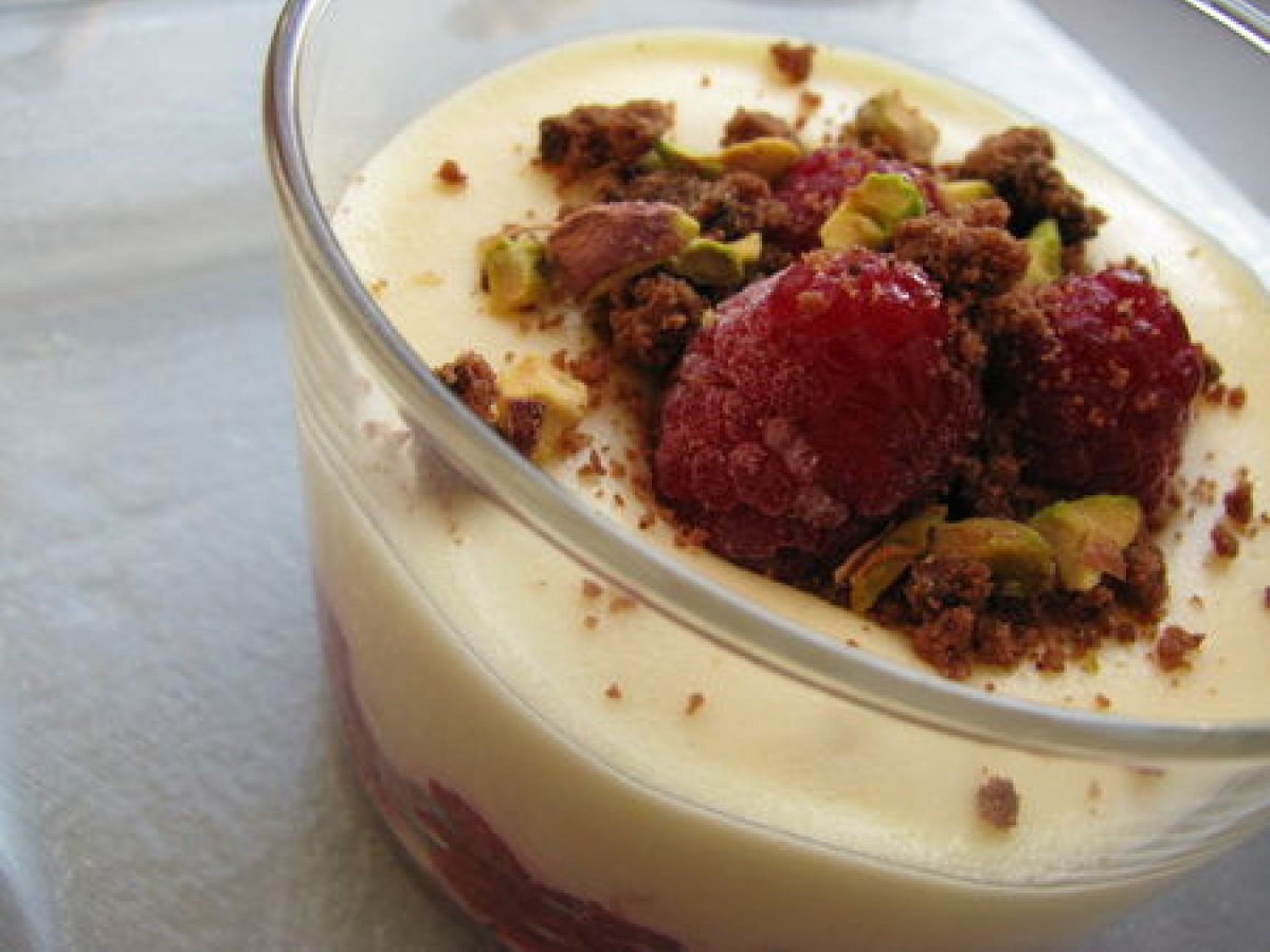 Tiramisu framboise pistache...ou comment fêter son anniversaire PrécédentSuivant Dessertfacile20 min272 Kcal Envoyer cette recette à un ami Imprimer cette page Poser une question à l'auteur Publier votre photo de cette recette Ingrédients 6 3 oeufs 250 g de mascarpone 80 g de sucre en poudre 6 biscuits à la cuillère 125 g de framboises 60 g de pistaches 4 biscuits sablés au chocolat 1 petit verre d'amaretto Coût estimé: 10.11Euros€ (1.68€/part)