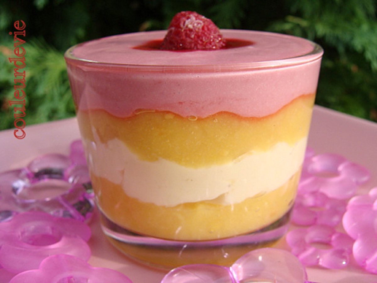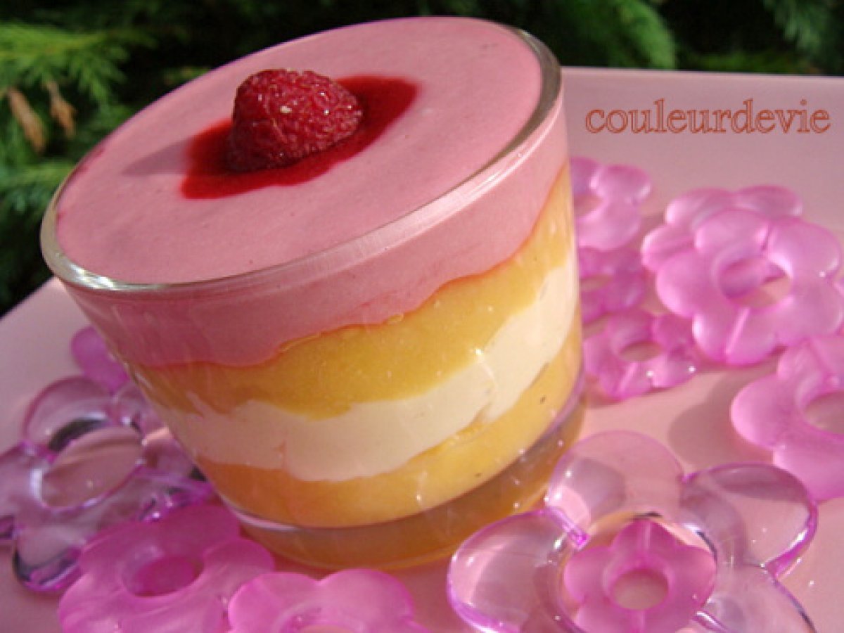 Verrine aux couleurs tendres, sympa et très bon ! Ces verrines sont composées de compote de coings, de crème pâtissière vanillée et crème aux framboises auxquelles on rajoute un peu de chantilly pour une texture plus mousseuse.