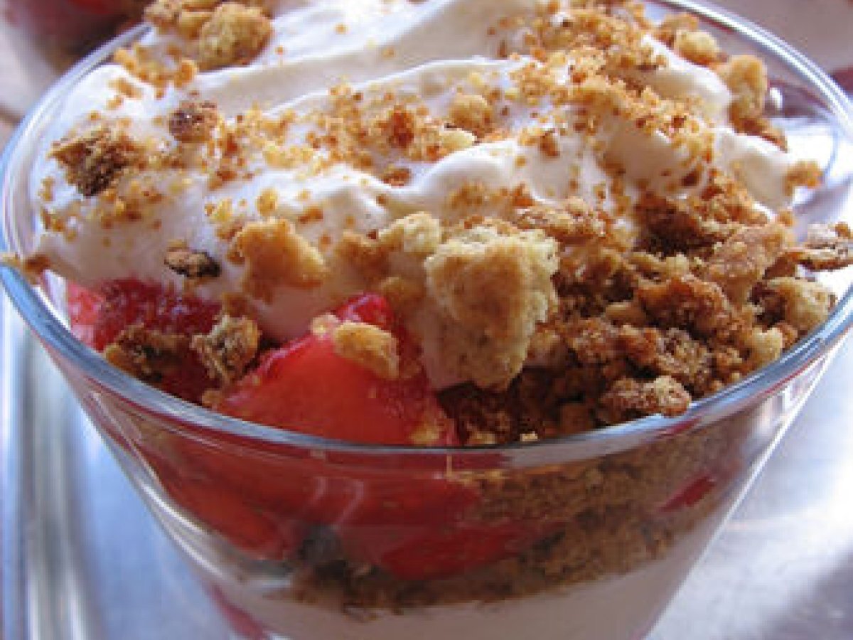 Verrine fraise et mascarpone croustillante Dessertfacile15 min276 Kcal Envoyer cette recette à un ami Imprimer cette page Poser une question à l'auteur Publier votre photo de cette recette Ingrédients 4 250 g de mascarpone 10 cl de crème liquide (allégée convient très bien) 2 blancs d-oeufs 1 sachet de sucre vanillé 2 cuillères à soupe de sucre glace 2 cuillères à soupe de sucre roux 500 g de fraises 4 gateaux sec (sablés Digestives) 50g de flocons d'avoine Coût estimé: 7.88Euros€ (1.97€/part)
