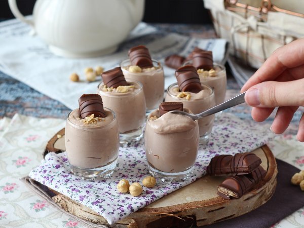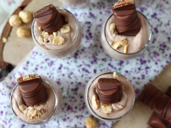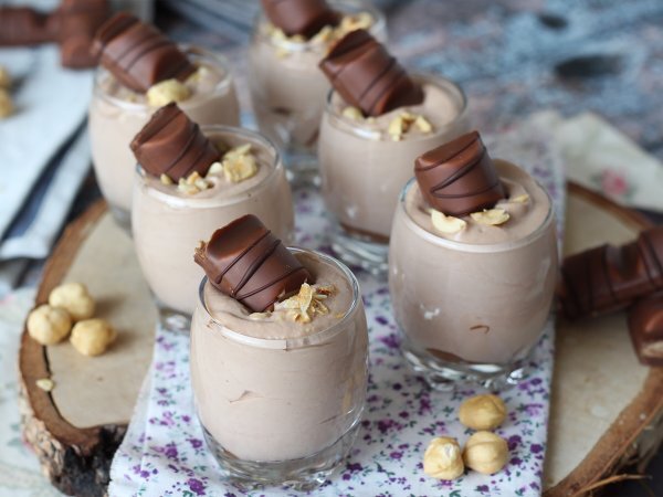 Décorer ensuite les verrines en parsemant de noisettes torréfiées concassées et en plantant un morceau de Kinder sur le dessus! Et voilà, c'est prêt! Facile non?