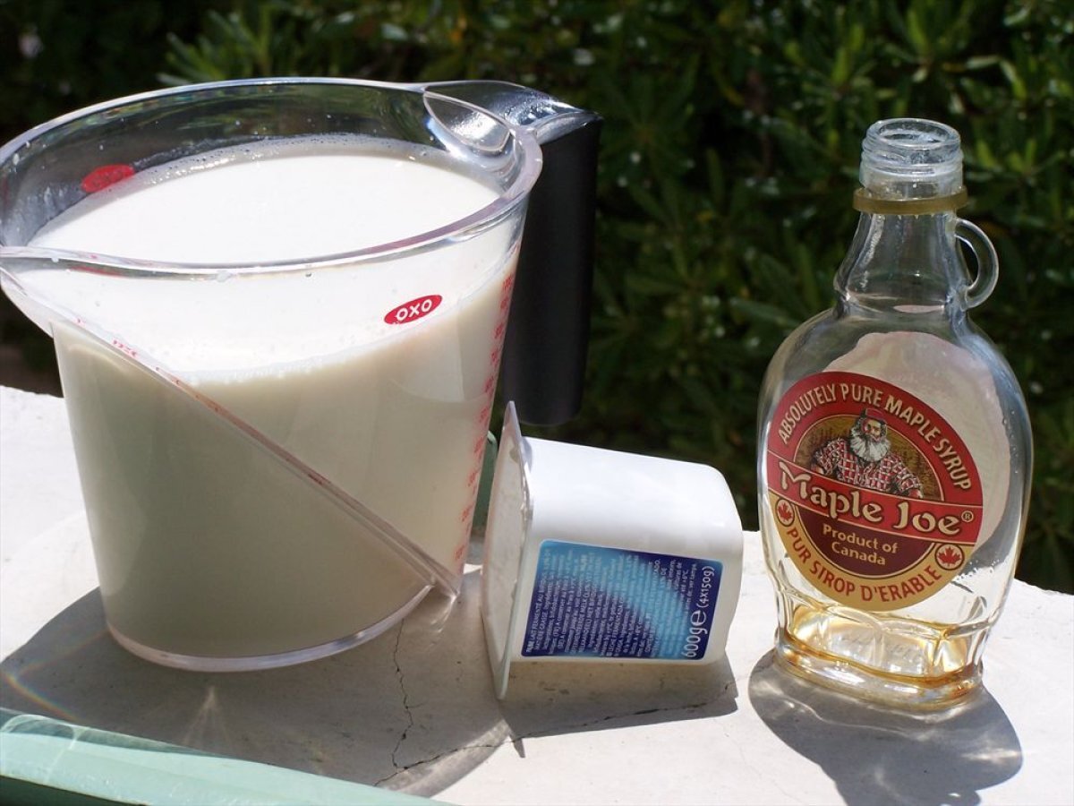 Ajouter le lait en plusieurs fois, en fouettant bien à chaque dilution. - Ajouter le sirop d'érable en continuant à fouetter. Laisser prendre entre 12 et 24 heures dans la yaourtière puis mettre au frais au moins 6 heures.
