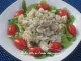 Ingrédients: 230 g de poulet coupé en lamelles 1 sachet de soupe à la tomate déshydratée 2 oeufs ail en poudre farine pâtes cuites la veille salade verte maïs...