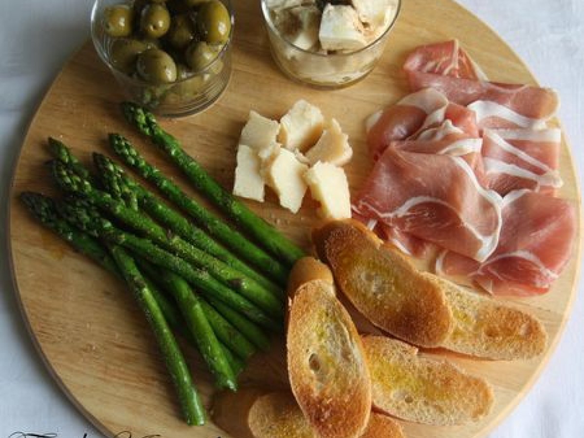 - Assaisonnez les asperges de sel, poivre et un filet d'huile puis disposez le tout sur une grande planche en bois