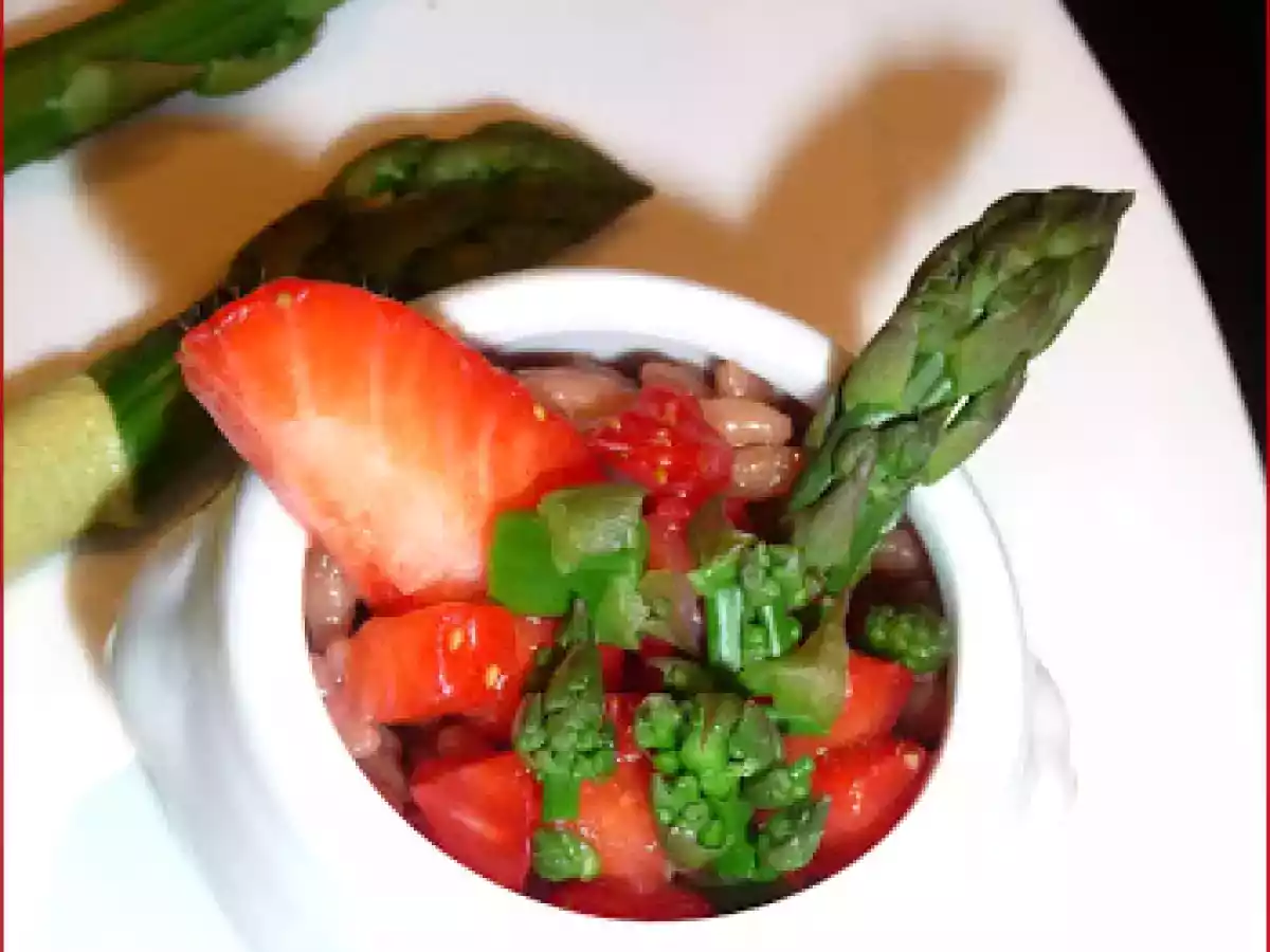 Asperges vertes en mousse et fraises ... votez maintenant Entréefacile1 h 30 m578 Kcal Envoyer cette recette à un ami Imprimer cette page Poser une question à l'auteur Publier votre photo de cette recette Ingrédients 4 Pour la Mousse d'Asperges: 1/2 botte d'Asperges Vertes 1 cuillère à café de Câpres au vinaigre 10 feuilles d'Épinards Filet d'Huile d'Olive 10 cl de Fond Blanc de volaille 10 cl de Crème liquide 100g de Crème fouettée Sel et Poivre 2 g d'Agar Agar Pour le Jus de Fraises: 250 g de Fraises 10 g de Sucre Filet de Jus de Citron 40 cl d'Eau Minérale Pour la Salade de Pâtes: le Jus de Fraises 20 cl de Pâte Arzetto 2 g Huile d'Olive Fleur de Sel 4 Fraises Copeaux d'Asperge Verte crue les pointes d'Asperges restantes 3 cuillères à soupe d'Huile d'Olive 1 cuillère à soupe de Vinaigre Balsamique 1 cuillère à café de Vinaigre de Xérès Sel et Poivre