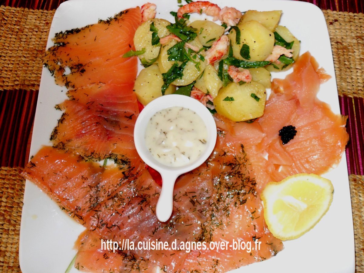 Disposez dans chaque assiette : une tranche de carpaccio da saumon , une tranche de saumon nature, une tranche de saumon à l'aneth, le 1/4 de la préparation de salade de pommes de terre , et mettre dans une petite coupelle un peu de sauce gravlax. Ajouter dans chaque assiette un quart de citron.