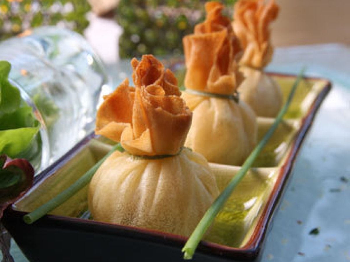 Aumonière au poulet aux saveurs asiatique Entréemoyen30 min Envoyer cette recette à un ami Imprimer cette page Poser une question à l'auteur Publier votre photo de cette recette Ingrédients 4 Ingrédients: 12 carrés de 10cm de pâte à wonton recette ici 150g de blanc de poulet 3 cas d'huile d'olive 1 oignon 10g de gingembre frais 2 cas de cacahuètes grillées et hachées 2 cas de coriandre fraîche ciselée 1 cc de sauce nuoc mam 1 cc de soja le jus 1/2 citron 1 cas de miel huile pour friture ciboulette pour la décoration. Pour la sauce : 100ml de vinaigre 1 cas de sucre 1 cc de sauce soja 1/2 cc de purée de piment rouge (ou un piment rouge finement haché) 1 pincée de sel.
