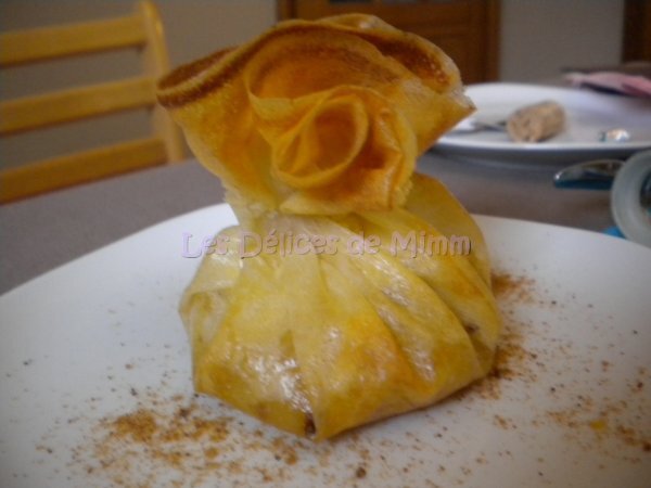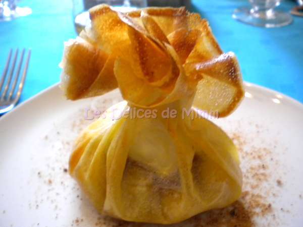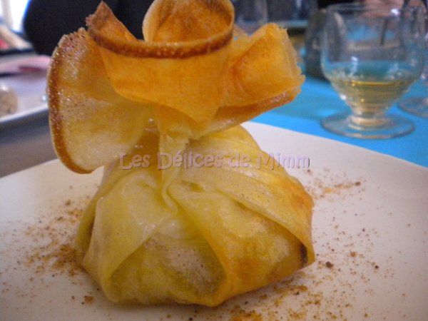 Aumônière de chèvre, pommes caramélisées, miel et pain dépices