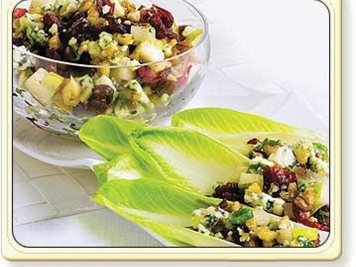 Bouchées de salade aux noix et canneberges sans gluten votez maintenant Entréefacile20 min Envoyer cette recette à un ami Imprimer cette page Poser une question à l'auteur Publier votre photo de cette recette Ingrédients 3 3/4 tasse canneberges sèches sucrées Craisins (175 mL) 2/3 tasse fromage Stilton ou autre fromage bleu émietté (150 mL) 1/2 tasse noix de Grenoble hachées (125 mL) 1 poire mûre hachée finement 1 cuillère à table ciboulette fraîche ou oignon vert haché (15 mL) 1/2 cuillère à thé poivre fraîchement moulu (2 mL) 1/4 cuillère à thé sel (1 mL) 1 cuillère à thé chacun de jus de citron et miel (5 mL) 2 cuillères à thé huile d?olive (10 mL) endives belges crudités craquelins sans gluten