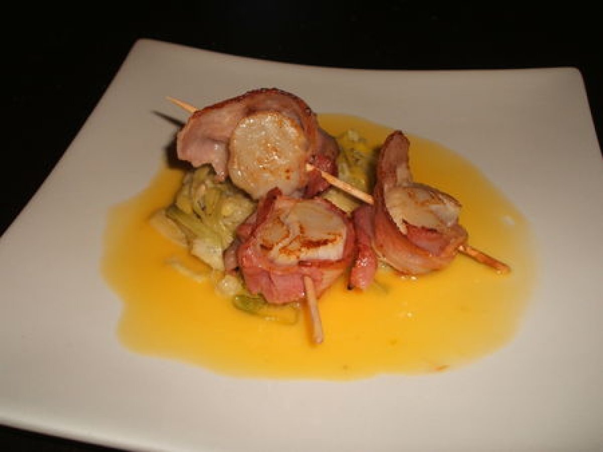 Brochettes de saint-jacques lardées au beurre d'oranges, fondue de poireaux Entréefacile35 min Envoyer cette recette à un ami Imprimer cette page Poser une question à l'auteur Publier votre photo de cette recette Ingrédients 2 8 noix de Saint-Jacques surgelées 8 tranches de poitrine nature 3 blancs de poireaux 1 cuillère à soupe de crème Pour le beurre d'oranges : le jus de 2 oranges 100 g de beurre très froid coupé en morceaux