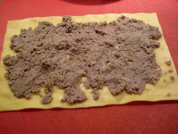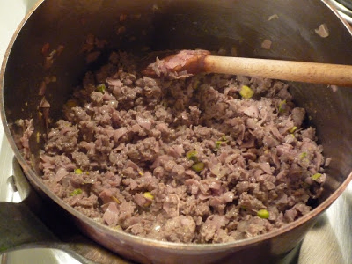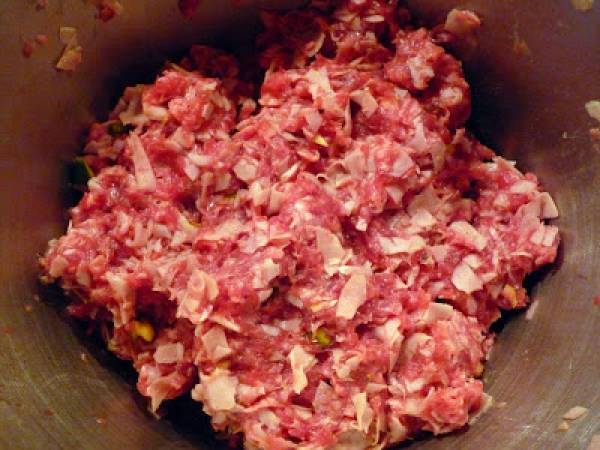Mélangez la mortadelle coupée avec la viande de bœuf hachée, ajoutez encore quelques pistaches, salez, poivrez et versez un peu de noix de muscade.