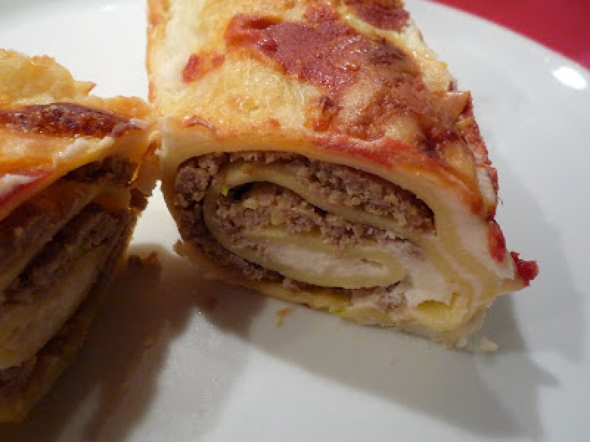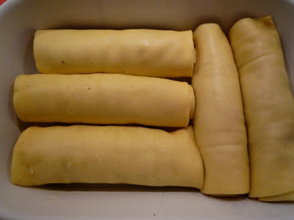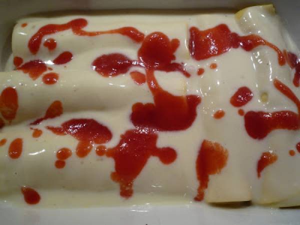 Précuire des feuilles de lasagne, devenues des cannelloni. Etalez la farce sur les feuilles et ajoutez un peu de sauce béchamel, sinon, ça devient trop sec....