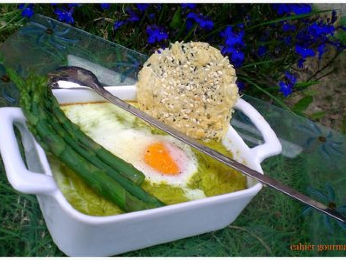 Caresse d'asperges vertes et son oeuf cocotte, tuile de parmesan au sésame et pavot