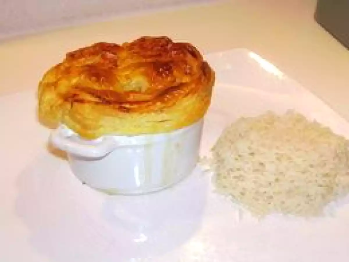 Saupoudrez une cuillère à café de chapelure sur le dessus de chaque cassolette. Recouvrez d'un disque de pâte feuilletée et soudez bien le bord de la pâte sur le ramequin.