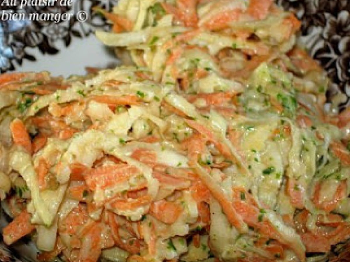 Céleri-rave et carottes en salade Entréefacile5 min Envoyer cette recette à un ami Imprimer cette page Poser une question à l'auteur Publier votre photo de cette recette Ingrédients 1 45 ml mayonnaise 45 ml moutarde de Dijon 15 ml vinaigre de vin rouge 15 ml miel 5 ml gingembre frais, haché 2 gousses d'ail, hachées au goût, sel et poivre 375 ml céleri-rave, râpé 375 ml (1 1/2 tasse) carottes, pelées et râpées au goût, persil frais haché