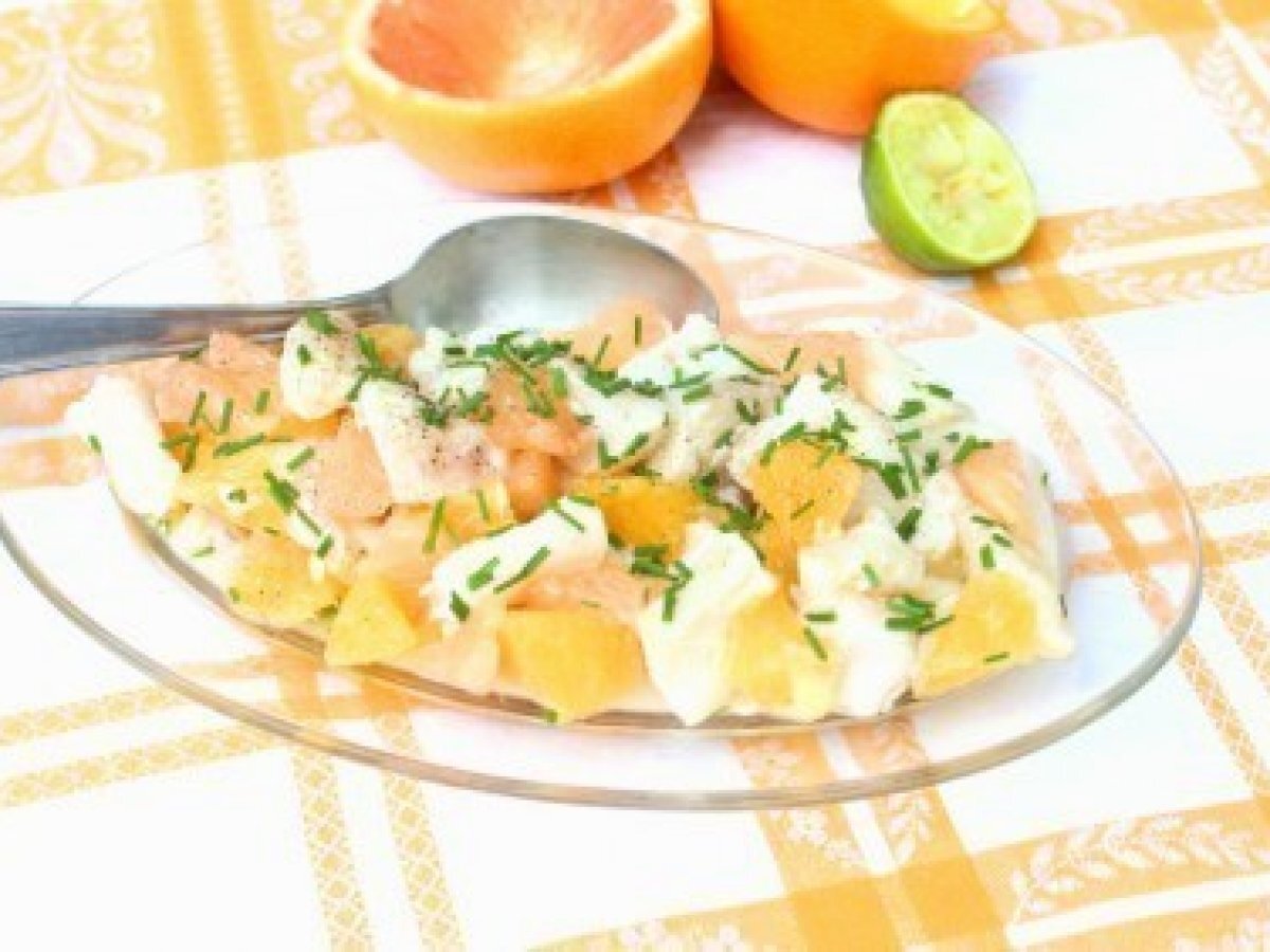- Couper en deux les oranges et les pamplemousses, puis prélever les suprêmes à l’aide d’un couteau. Ajouter les morceaux d’agrumes au poisson, bien mélanger. Assaisonner de sel, poivre, et piment de Cayenne. Parsemer de ciboulette ciselée et des zestes de citron vert. Servir très frais.