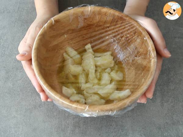 Préparez la marinade : découpez votre poisson en fines lamelles. Ensuite, dans un bol, mélangez ensemble l’huile d’olive, le jus de citron vert, le sel, le poivre et le poisson.